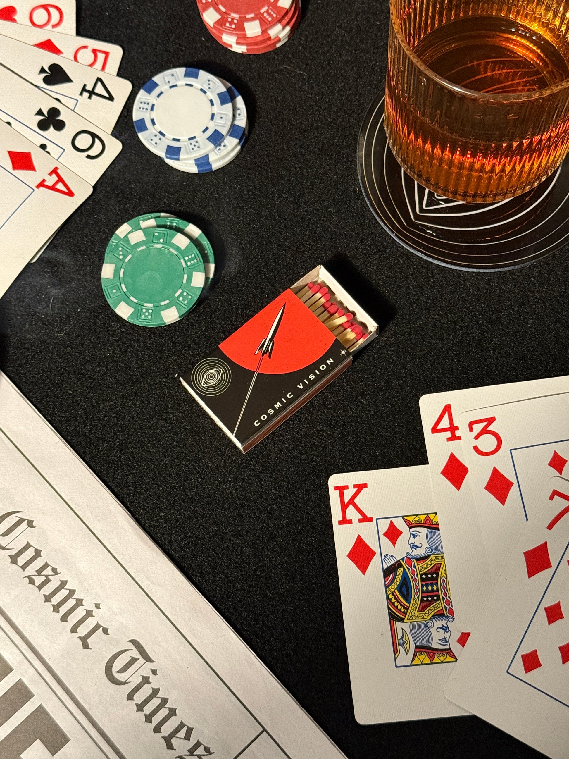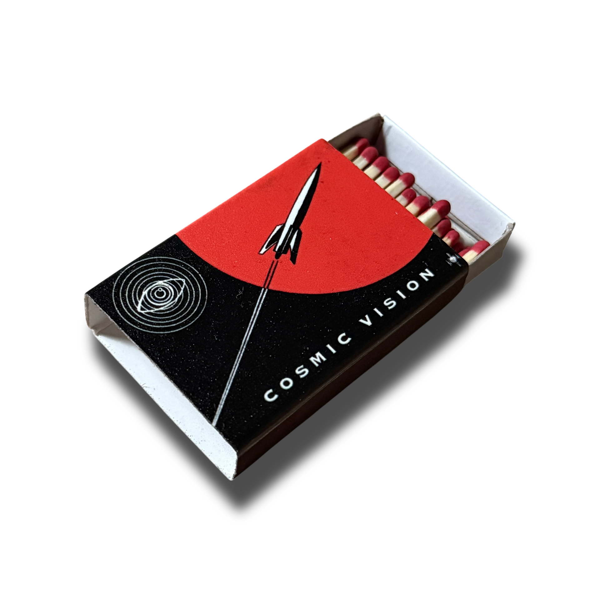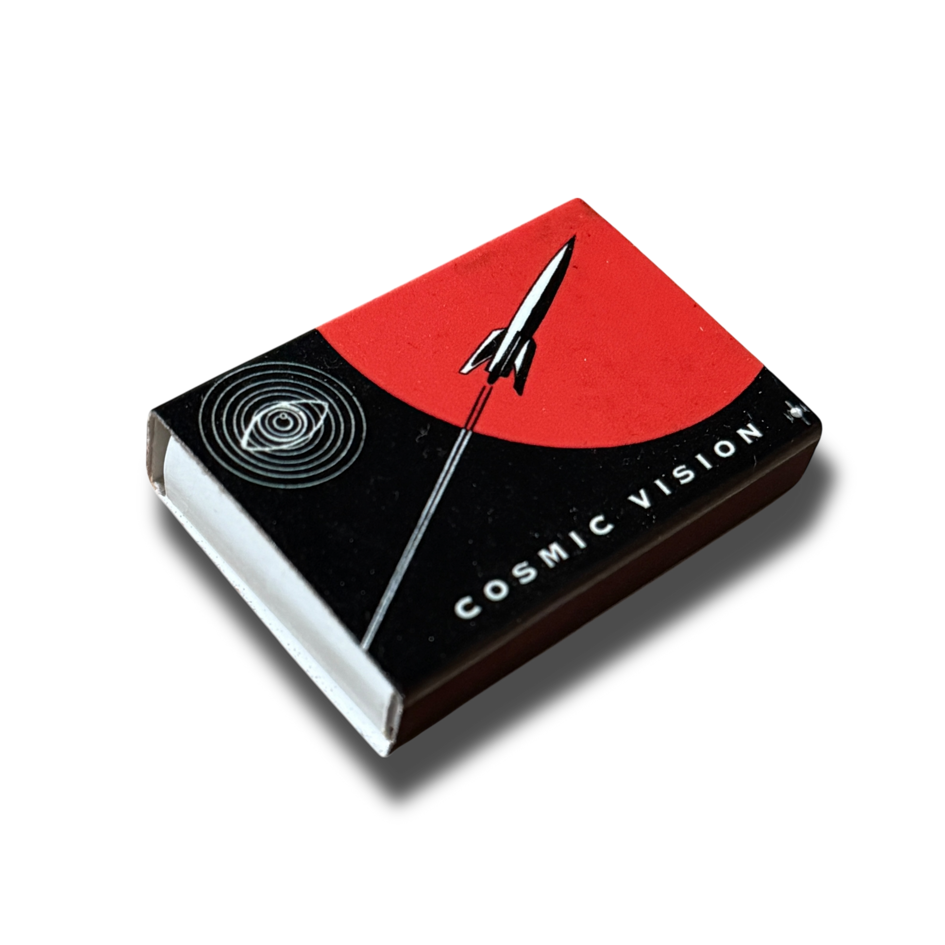 Vintage sci-fi and Space Age-era space exploration illustration on a matchbook.